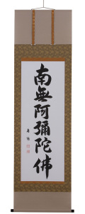 商品名:六字名号 【直筆作品】 作家名:服部廣陽 「南無」とは、帰依するを意味し、「阿弥陀仏に帰依する」の意。 南無阿弥陀仏の六字は、法蔵菩薩(阿弥陀仏の修行〈因位〉時の名)が修行し、大願大行を成就して正覚を得た上の名であるから、「果号」とも呼ばれます。如来のはたらきのすべて顕すとして、名号の中でも最も尊重され、本尊として用いられます。