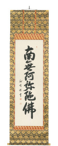 商品名:六字名号 【直筆作品】 作家名:大谷龍峰 「南無」とは、帰依するを意味し、「阿弥陀仏に帰依する」の意。 南無阿弥陀仏の六字は、法蔵菩薩(阿弥陀仏の修行〈因位〉時の名)が修行し、大願大行を成就して正覚を得た上の名であるから、「果号」とも呼ばれます。如来のはたらきのすべて顕すとして、名号の中でも最も尊重され、本尊として用いられます。