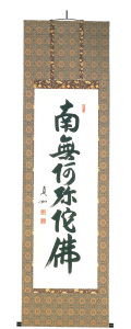 商品名:六字名号 【直筆作品】 作家名:山本真如 「南無」とは、帰依するを意味し、「阿弥陀仏に帰依する」の意。 南無阿弥陀仏の六字は、法蔵菩薩(阿弥陀仏の修行〈因位〉時の名)が修行し、大願大行を成就して正覚を得た上の名であるから、「果号」とも呼ばれます。如来のはたらきのすべて顕すとして、名号の中でも最も尊重され、本尊として用いられます。