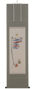 商品名:こいのぼり 【直筆作品】 作家名:今井玄花 こいのぼりは、江戸時代に武家で始まった日本の風習で、端午の節句に、男児の出世を願って家庭の庭先に飾られてきました。 風になびくこいのぼりを眺める男児がほのぼのとしていて、和やかな気持ちにさせてくれます。 逞しい成長を願う節句飾りに相応しい掛軸です。男子誕生のお祝いなどの贈答用にも喜ばれます。
