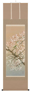 咲き誇る桜につがいの小鳥が描かれた、春の可愛らしい掛軸です。
