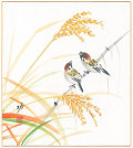 収穫の時期にぴったりな稲穂と愛らしい夫婦小鳥の色紙です。