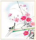 秋にぴったりな月とコスモスと愛らしい小鳥の色紙です。