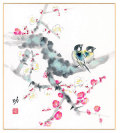 初春にぴったりな紅白梅と愛らしい夫婦小鳥の色紙です。