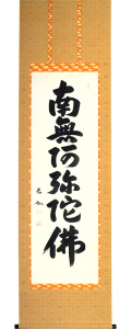 商品名:六字名号(絹本時代引) 【直筆作品】 作家名:丹羽光如 「南無」とは、帰依するを意味し、「阿弥陀仏に帰依する」の意。 南無阿弥陀仏の六字は、法蔵菩薩(阿弥陀仏の修行〈因位〉時の名)が修行し、 大願大行を成就して正覚を得た上の名であるから、「果号」とも呼ばれます。 如来のはたらきのすべて顕すとして、名号の中でも最も尊重され、本尊として用いられます。