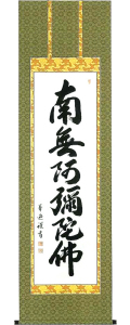 商品名:六字名号 【直筆作品】 作家名:中村草遊 「南無」とは、帰依するを意味し、「阿弥陀仏に帰依する」の意。 南無阿弥陀仏の六字は、法蔵菩薩(阿弥陀仏の修行〈因位〉時の名)が修行し、 大願大行を成就して正覚を得た上の名であるから、「果号」とも呼ばれます。 如来のはたらきのすべて顕すとして、名号の中でも最も尊重され、本尊として用いられます。