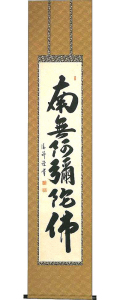 商品名:六字名号 【直筆作品】 作家名:安藤徳祥 「南無」とは、帰依するを意味し、「阿弥陀仏に帰依する」の意。 南無阿弥陀仏の六字は、法蔵菩薩(阿弥陀仏の修行〈因位〉時の名)が修行し、 大願大行を成就して正覚を得た上の名であるから、「果号」とも呼ばれます。 如来のはたらきのすべて顕すとして、名号の中でも最も尊重され、本尊として用いられます。